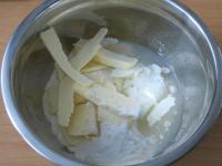 Egy tálba szórjuk a lisztet és összekeverjük a szóda bikarbónával. Hozzáadjuk a felvágott puha vajat, cukrot és a túrót. Kidolgozzuk a tésztát.