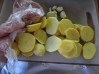 A krumplit meghámozzuk, megmossuk, és karikákra vágjuk. A sertés szeleteket enyhén kiklopfoljuk. A hagymát és fokhagymát megpucoljuk, a hagymát karikákra a fokhagymát szeletekre vágjuk.