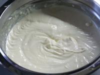 A krémet tejfölös kenő, puding, cukor, vanília cukor és rum összekeverése által készítjük el.
