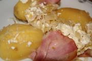 A tepsit zsírral kikenjük, ráhelyezzük a burgonyát az egyenes oldalával lefelé, majd letakarjuk a szalonna szeletekkel. Lefedve, előmelegített sütőben, 200°C kb. 50 percig sütjük.