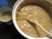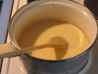 Tejből, cukorból és pudingporból sűrű pudingot főzünk.