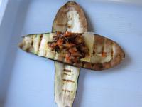 A létrejött batyucskát egy fogvájó segítségével összetűzzük. A töltött padlizsánt tálalás előtt 2 percig megmelegítjük a grillen.