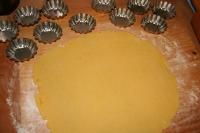Kosárka forma segítségével kivágjuk a tésztát, majd a formában elegyengetjük a tésztát. Villával átszúrjuk a tésztát, és a formákat a sütőlapra rakjuk, előmelegített sütőben kb 10 percig rózsaszínre sütjük.