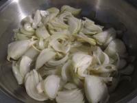 Nagyobb fej hagymákat megpucolunk, kettévágjuk vékony szeletekre vágjuk. A serpenyőben felmelegítjük az olajat, és megpirítjuk a hagymát.