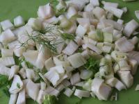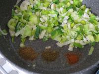 A póréhagymához hozzáadjuk a fűszereket, összekeverjük.