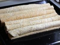 A sütést követően lágy puha tésztát kapunk, amelyet még melegen elválasztunk a sütőpapírtól és hosszában 3 csíkra vágjuk.