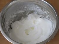 A felvert tojásba vizet, olajat és váltakozva lisztet és a fehérjéből készült kemény habot keverjük bele.