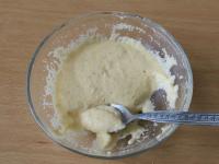 A tojást felverjük, nem habosra, mert egész tojással dolgozunk, de alaposan. Belekeverjük a grízt, sűrű tejföl állagú tésztát kapunk. 10 percig állni hagyjuk.