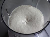 A kókuszos tejszín konzervből kiszedjük a tetején lévő sűrű masszát, majd a turmixgében rakjuk és (víz nélkül) mixereljük az előtte beáztatott kesu dióval.
