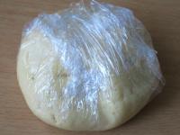 Sima tésztát dolgozunk ki, amelyet fóliába csomagolunk és egy órára a hűtőbe helyezzük pihenni.