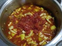 Végül hozzáadjuk a paradicsomot a levével együtt, összekeverjük és felforraljuk. A pörkölthöz hozzáadjuk a megtisztított, préselt fokhagymát. Sózzuk ízlés szerint.