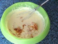 A lisztből, egy csipetnyi sóból,tejből, tojásból, szódavízből és a átnyomott burgonyából sima tésztát keverünk ki.