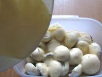 A gombákat megpucoljuk a gomba szárait félre rakjuk. A gombafejeket a tésztába helyezzük és egy villával óvatosan megkeverjük.