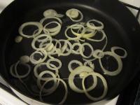 A hagymát megpucoljuk, karikákra vágjuk majd egy kis forró olajon megpirítjuk. Rövid ideig pirítjuk.