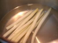 A vizet felforraljuk, hozzáadjuk a cukrot, sót és egy csipetnyi olajat. Amikor a víz felforr, beletesszük a spárgát, 5 percig főzzük. Öt perc után a spárgát kivesszük és hűvös helyre helyezzük.