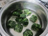 A mirelit spenótdarabokat folyóvíz alatt leöblítjük egy szűrő segítségével, majd egy lábasba helyezzük, és felöntjük vízzel. 10 percig főzzük.