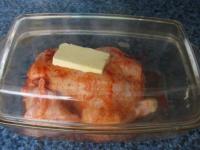 A csirkét jól megmossuk, besózzuk, és mindkét oldalát bedörzsöljük őrölt piros paprikával.