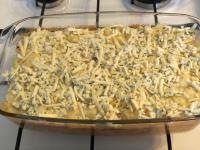 Rakott karfiol pikáns Niva sajttal, amely a francia Roquefort sajtnak megfelelő.