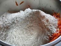 Egy nagyobb lábasba lereszeljük a tök húsát. Hozzáadunk mazsolát, tojást, cukrot és vanília cukrot. Az egészet jól összekeverjük.