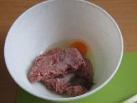 Az őrölt húst összekeverjük a tojással, sóval és a fűszerrel.