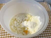 Öntsük mindkét lisztet és a cukrot egy mély tálba adjunk hozzá egy csipet sót, tojást, olajat és élesztőt . Keverjünk össze egy finom tésztát, és hagyjuk lefedve 30 percig kelni.