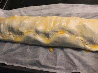 A tésztát sütőpapírral bélelt tepsire kinyújtjuk. A közepébe egyenletesen rakjuk a tök tölteléket. Tekerjük fel.