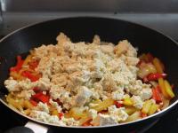 A paprikát megmossuk és csíkokra vágjuk. Hozzáadjuk a burgonyához és a hagymához, majd egy percig pirítjuk.