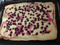 A tésztára rá borítjuk a túrós masszát. a tetejére egyenletesen rá szórjuk a szőlő szemeket.