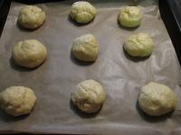A megkelt tésztából 16 golyót formálunk és sütőpapírral bélelt tepsire helyezzük őket, egymástól egy kicsit távolabb. További 10 percig hagyjuk még kelni.