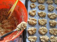Összegyúrjuk a tésztát. A tésztából kanállal kis darabokat veszünk el, amelyeket a sütőpapírral bélelt sütőlapra helyezünk.