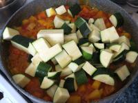 A póréhagymához adjuk a zöldségeket, kivéve a cukkinit. Felöntjük vízzel, sózzuk és összekeverjük.